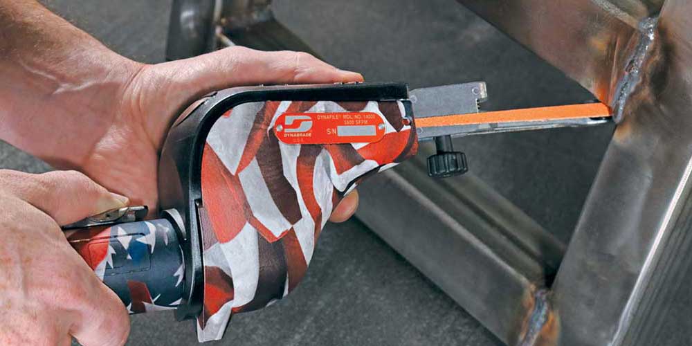Dynabrade tools have been proudly designed, manufactured and built in the USA for over 50 years. One of the ways we celebrated our Made in the USA pride was, by offering a limited edition Dynafile®. Our model 14000USA Dynafile® was draped in the Stars & Stripes of the American flag. The USA Dynafile® is the same fully functioning abrasive belt tool that can reliably track an 1/8th" wide belt and offers the most contact arm options to tackle any industrial grinding, blending and polishing application using 24" long belts.